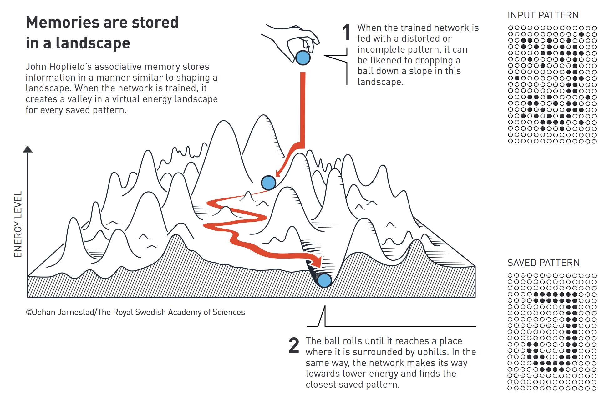 O americano John J. Hopfield, físico e biólogo, inventou uma rede que utiliza um método para guardar e recriar padrões: a rede de Hopfield. Estabeleceu uma analogia entre a física que descreve as características de um material devido ao seu spin atómico e uma rede com valores para as ligações entre os nós. Através da procura destes valores, a rede é treinada, de modo a que as imagens guardadas tenham baixa “energia”; isto é, há a procura de mínimos de uma função de energia, que depende dos parâmetros da rede. Quando a rede de Hopfield é alimentada com uma imagem distorcida, atualiza os seus valores iterativamente para que a energia da rede diminua, convergindo para encontrar a imagem armazenada mais próxima da imagem distorcida com que foi alimentada. Uma imagem computacionalmente é uma matriz de pixels, onde cada pixel é representado por valores numéricos que codificam informações visuais, como cor e intensidade de luz.