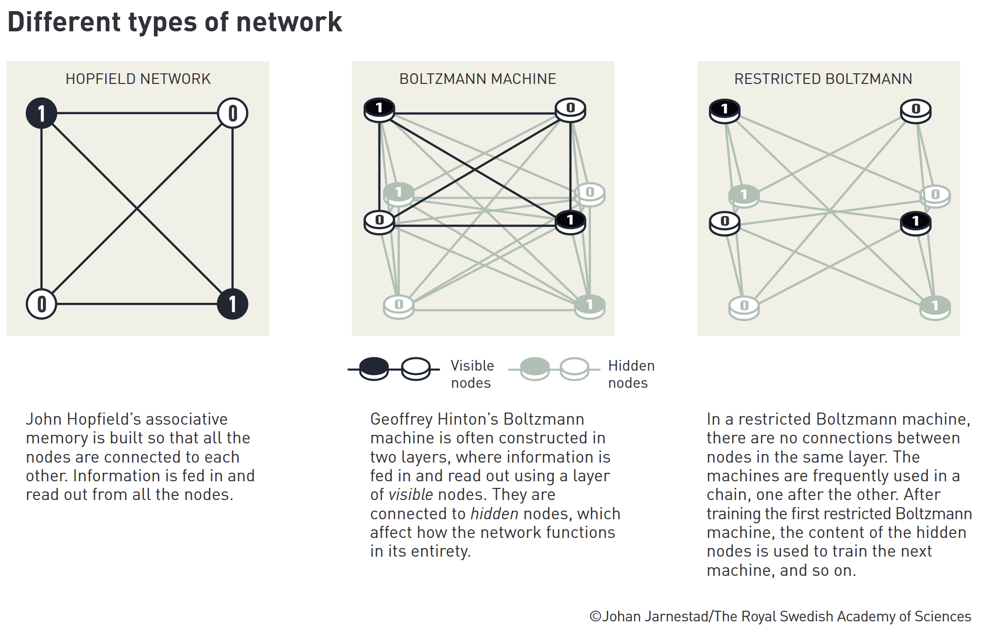 O britânico-canadiano Geoffrey Hinton, psicólogo cognitivo e cientista da computação, utilizou a rede de Hopfield como base para uma nova rede com um método diferente: a máquina de Boltzmann, que aprende a reconhecer de forma autónoma propriedades nos dados e, assim, identificar elementos específicos em imagens. O nome da máquina é uma homenagem a um dos mais importantes físicos do século XIX e pioneiro da Física Estatística.