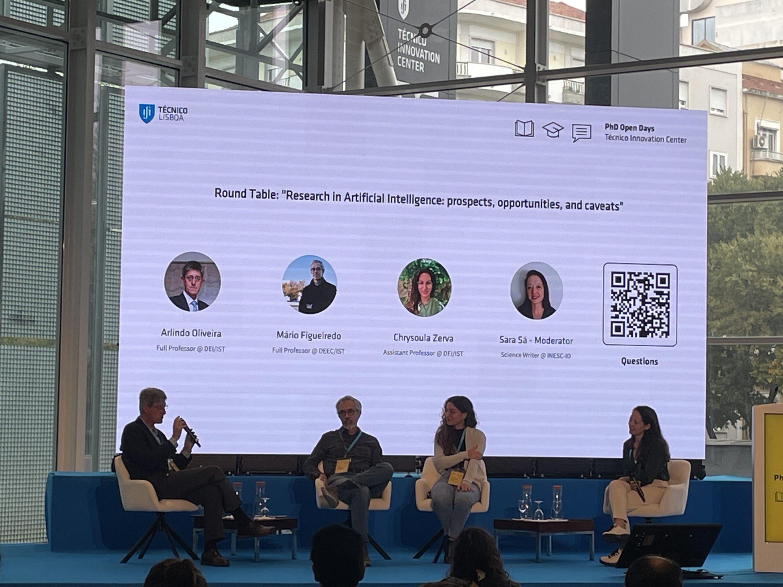 O segundo dia do PhD Open Days começou com a mesa redonda intitulada “Research in Artificial Intelligence: prospects, opportunities, and caveats, que contou com a participação de Arlindo Oliveira,Professor no DEI, Mário Figueiredo,Professor no DEEC, e Chrysoula Zerva, Professora no DEI, como intervenientes, e de Sara Sá, Science Writer no INESC-ID, como moderadora. O principal tema discutido foi o desenvolvimento da IA e o seu uso na investigação.