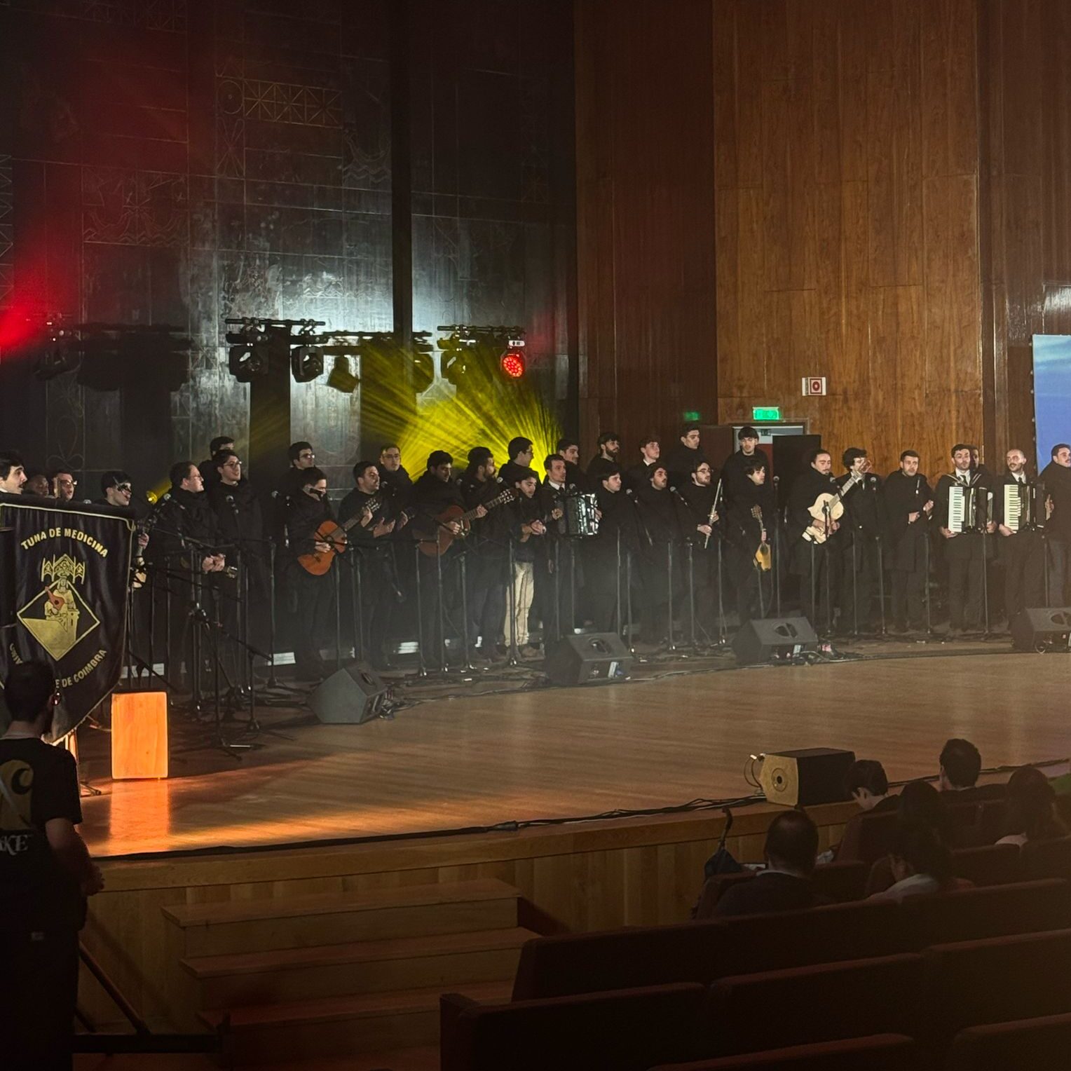Por fim, a TUIST encerrou a noite com um pequeno ato teatral cómico, protagonizado por um português, um brasileiro e um francês, que arrancou gargalhadas ao público e serviu de introdução a um repertório variado. Entre as músicas apresentadas, vale a pena enfatizar Dou-me ao Mar, um clássico da tuna, e Lisboa Não Sejas Francesa, de Amália Rodrigues. Um dos momentos mais simbólicos da atuação foi a interpretação de Cálice, de Chico Buarque e Gilberto Gil. Composta em 1973, a música foi censurada pela ditadura militar brasileira e só foi lançada em 1978, tornando-se um hino de resistência contra a repressão, a tortura e a dor do povo brasileiro. Nesta mescla de culturas entre nações irmãs, a TUIST escolheu Cálice para celebrar os 50 anos da Revolução dos Cravos, reforçando o seu significado como símbolo de liberdade.