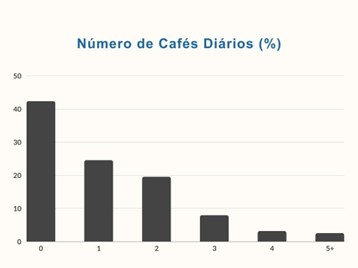 Sobre o número de cafés consumido diariamente pelos estudantes do Técnico, só 42% dos inquiridos afirmaram não beber qualquer café. 25% dos estudantes bebem 1 café por dia e 20% bebem 2. Dos restantes 13%, 2.2% afirmaram beber 5 ou mais cafés por dia.