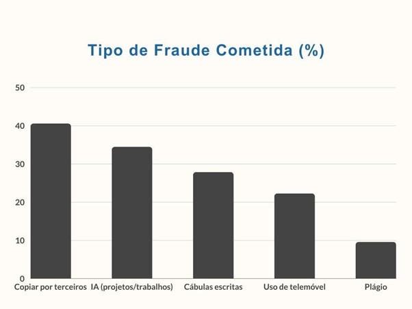 Apenas 31% dos inquiridos alegam nunca ter cometido fraude académica, enquanto que 61% o faz ocasionalmente ou raramente. Constatou-se que os métodos mais comuns para esta prática foram a “Cópia por terceiros” (202 dos inquiridos) e a utilização de Inteligência Artificial fora dos moldes definidos para a realização de projetos e trabalhos (172 inquiridos).