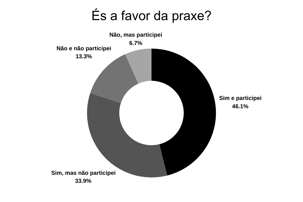 80% dos inquiridos consideraram-se a favor da praxe mas só 53% participaram. Notou-se uma correlação fraca entre os que estão a favor e se alinham com partidos da direita.