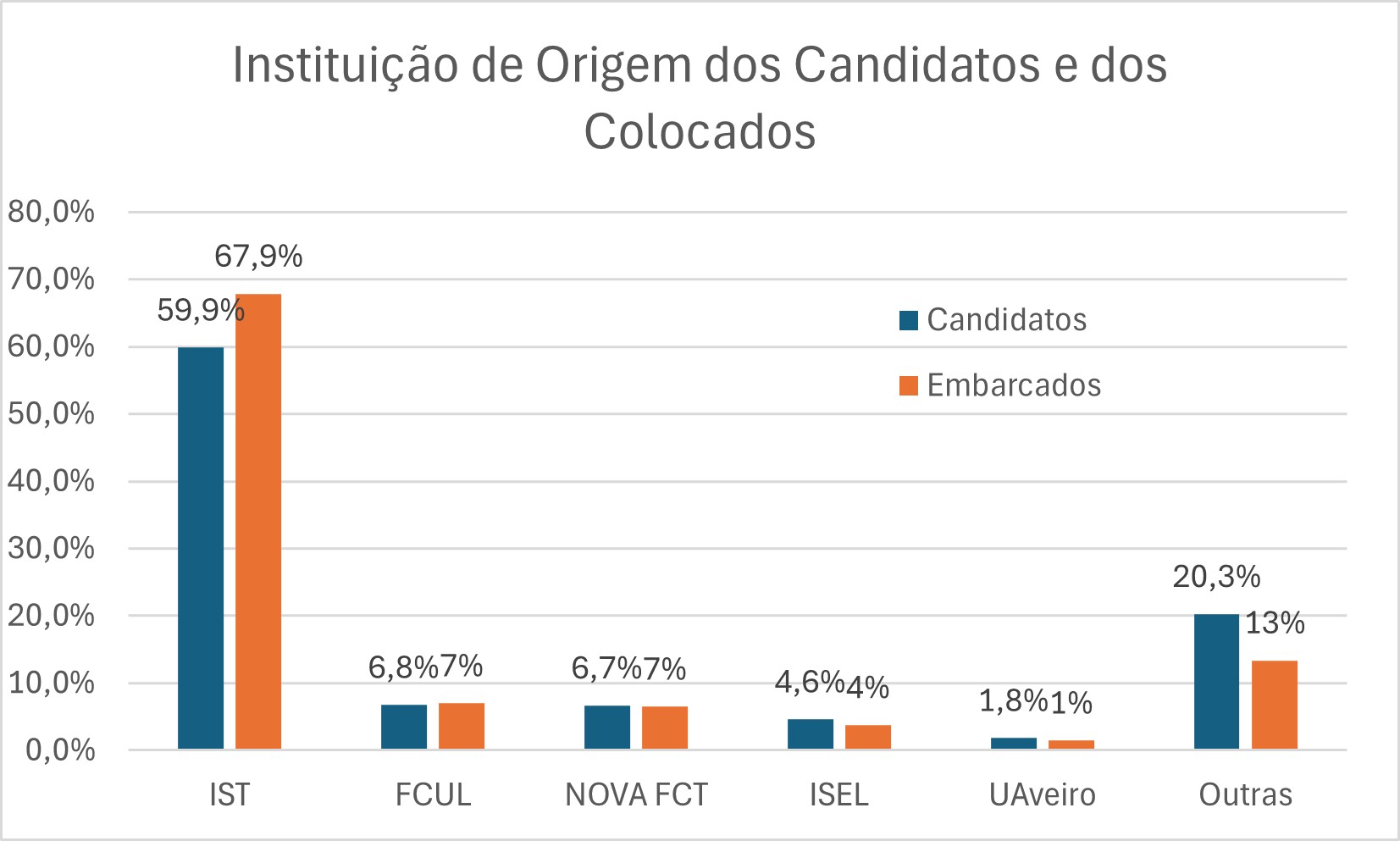 Quanto à origem dos candidatos, 59,9% provêm do Instituto Superior Técnico (1400 alunos), seguindo-se 6,8% da Faculdade de Ciências da Universidade de Lisboa, 6,7% da Faculdade de Ciências e Tecnologia da Universidade NOVA de Lisboa e 4,6% do Instituto Superior de Engenharia de Lisboa. Os restantes 22% são provenientes de outras universidades. Relativamente aos embarcados, a percentagem de alunos do IST sobe para 67,9% do número total.