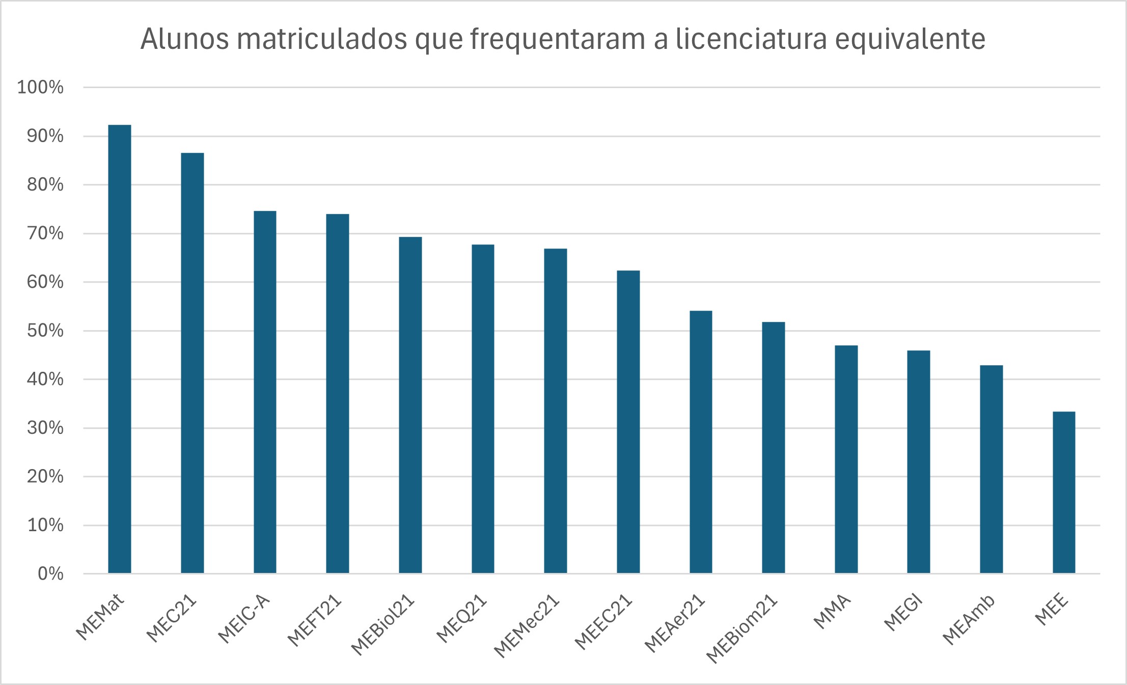 De outras migrações entre cursos destaca-se a mudança dos alunos de Licenciatura de Engenharia Física e Tecnológica para os Mestrados de Matemática Aplicada e Computação (7 alunos) e para Engenharia Eletrotécnica e de Computadores (16 alunos). Além disso, destacam-se também mudanças dos alunos das Licenciaturas de Engenharia Biológica para os Mestrados em Engenharia Biomédica (6 alunos) e Engenharia e Gestão Industrial (7 alunos), e de Engenharia Mecânica para os Mestrados em Engenharia e Gestão Industrial (9 alunos) e Engenharia Aeroespacial (7 alunos). Engenharia e Gestão Industrial destaca-se por ter atraído 53 alunos que não frequentaram a Licenciatura equivalente (LEGI), perfazendo 54% dos alunos embarcados, tendo atraído alunos principalmente das Licenciaturas de Engenharia Biológica, Química, Mecânica, e Eletrotécnica e de Computadores.