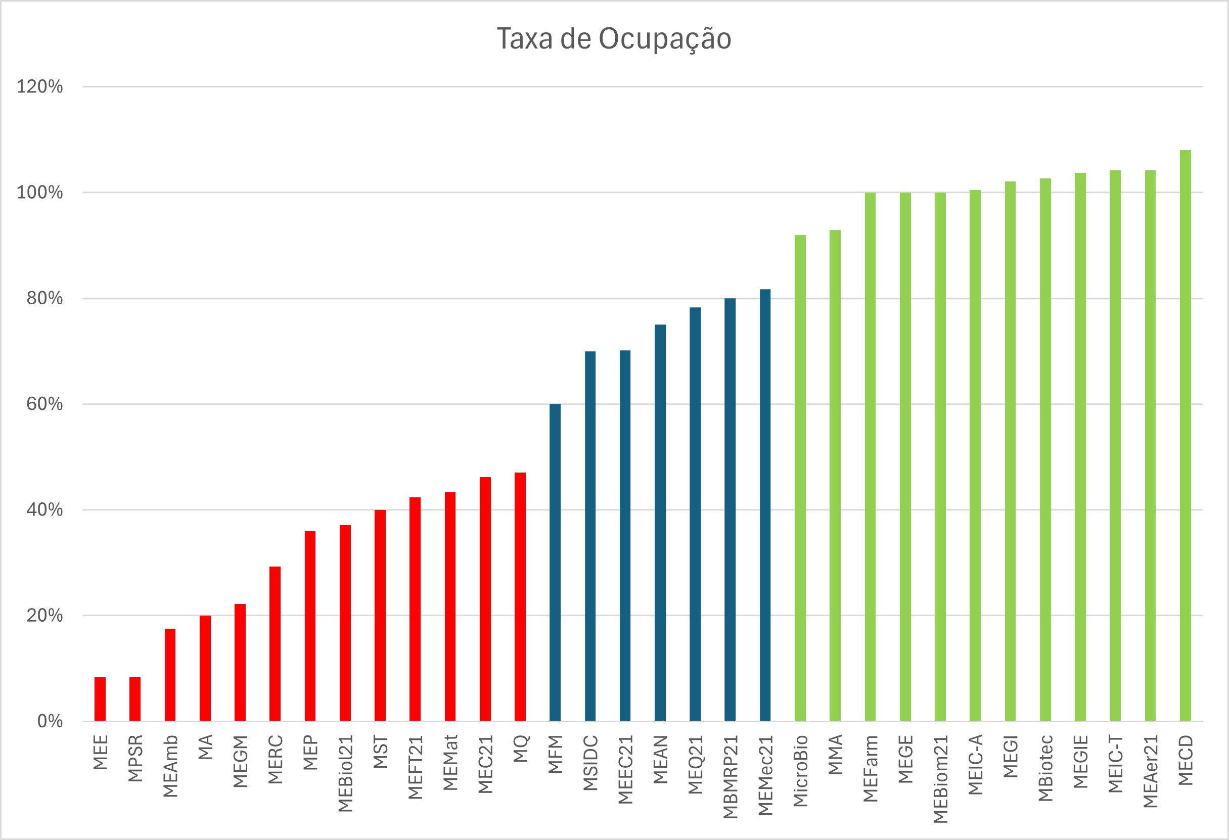 Dos 32 Mestrados, 10 preencheram a totalidade de vagas disponíveis, não apresentando vagas para a 2ª fase de candidaturas, mais dois que no ano letivo passado. Este ano, Engenharia Aeroespacial, Engenharia Biomédica e Engenharia Farmacêutica preencheram a totalidade do número de vagas, o que não aconteceu no ano passado. Pelo contrário, Bioengenharia e Medicina Regenerativa e de Precisão, que havia preenchido totalmente as suas vagas, não conseguiu fazê-lo este ano. Alguns cursos têm ainda quase a totalidade das vagas disponíveis, como Engenharia Eletrónica, com 33 vagas disponíveis em 36, ou Arquitetura, e Proteção e Segurança Radiológica, com apenas 1 vaga ocupada das 5 e 12 disponíveis, respetivamente.