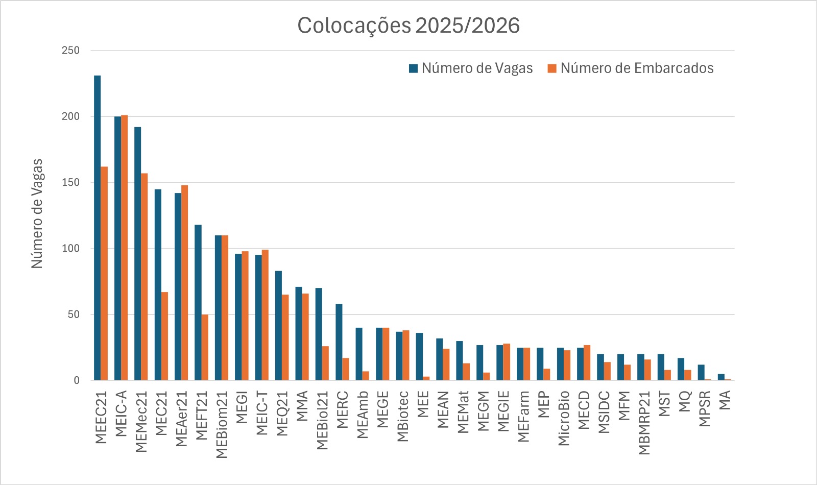 Os embarcados que transitam da FCUL entraram principalmente em Biotecnologia (23 alunos), Engenharia Informática e de Computadores, na Alameda, e Engenharia Biomédica (16 alunos cada). Já os alunos da NOVA FCT distribuíram-se principalmente pelos cursos de Engenharia Informática e de Computadores, Engenharia e Gestão Industrial, Engenharia Mecânica (13 alunos cada) e Engenharia Aeroespacial (12 alunos). Os alunos oriundos do ISEL entraram maioritariamente em Engenharia Mecânica (15 alunos) e Engenharia Informática e de Computadores, no Taguspark (11 alunos).