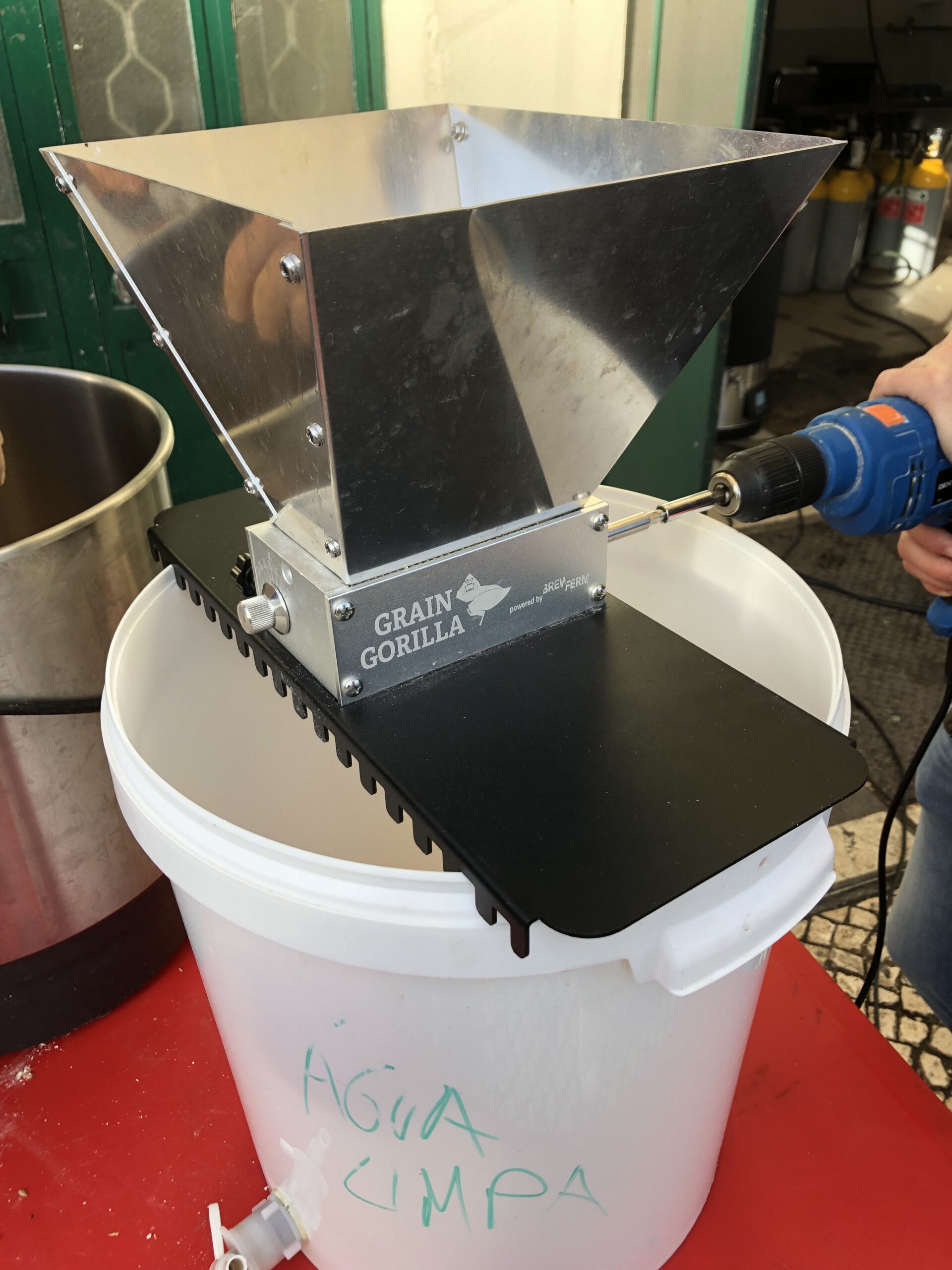 João Alexandre, membro do departamento de produção e investigação, procede à limpeza de alguns instrumentos necessários e prepara os materiais para dar início ao segundo passo do processo: a moagem. O objetivo desta fase é a exposição dos açúcares. À medida que vão colocando o malte dentro do moinho, os cervejeiros preocupam-se em ajustar a velocidade da máquina para que este não fique demasiado moído. A manivela do moinho foi substituída por um berbequim para acelerar o processo. “Nós somos engenheiros, temos que usar isso a nosso favor para fazer algo como deve de ser”, afirma André Godinho.
