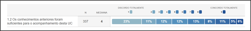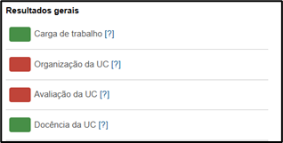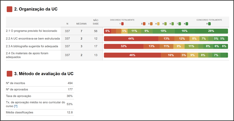 Em primeiro lugar, é de notar que existem 2 tipos de QUC a serem preenchidos pelos estudantes. O primeiro refere-se aos “Resultados Gerais da UC” e o segundo aos “Resultados Gerais do Docente”, sendo o seu preenchimento feito com recurso a uma escala de Likert de 1 (discordo totalmente) a 9 (concordo totalmente) para cada questão. E deve-se também destacar que somente é atribuído um “Resultado Inadequado” para respostas com “mediana do item ≤ 3”.