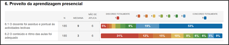 Em segundo lugar, é importante realçar que questões como “o docente foi assíduo e pontual às atividades letivas” têm o mesmo peso na avaliação que “o conteúdo e ritmo das aulas foi adequado”. E com esta observação, não está a ser diminuída a importância da assiduidade nas aulas, mas sim a mostrar um dos motivos pelo qual muitos docentes apresentam notas inflacionadas por parâmetros que, apesar de relevantes, não são fulcrais para uma metodologia de ensino eficaz. Classificações de 9 e 3 (como na imagem seguinte) resultam numa média de 6 para este grupo de questões, o que seria considerado um resultado regular.